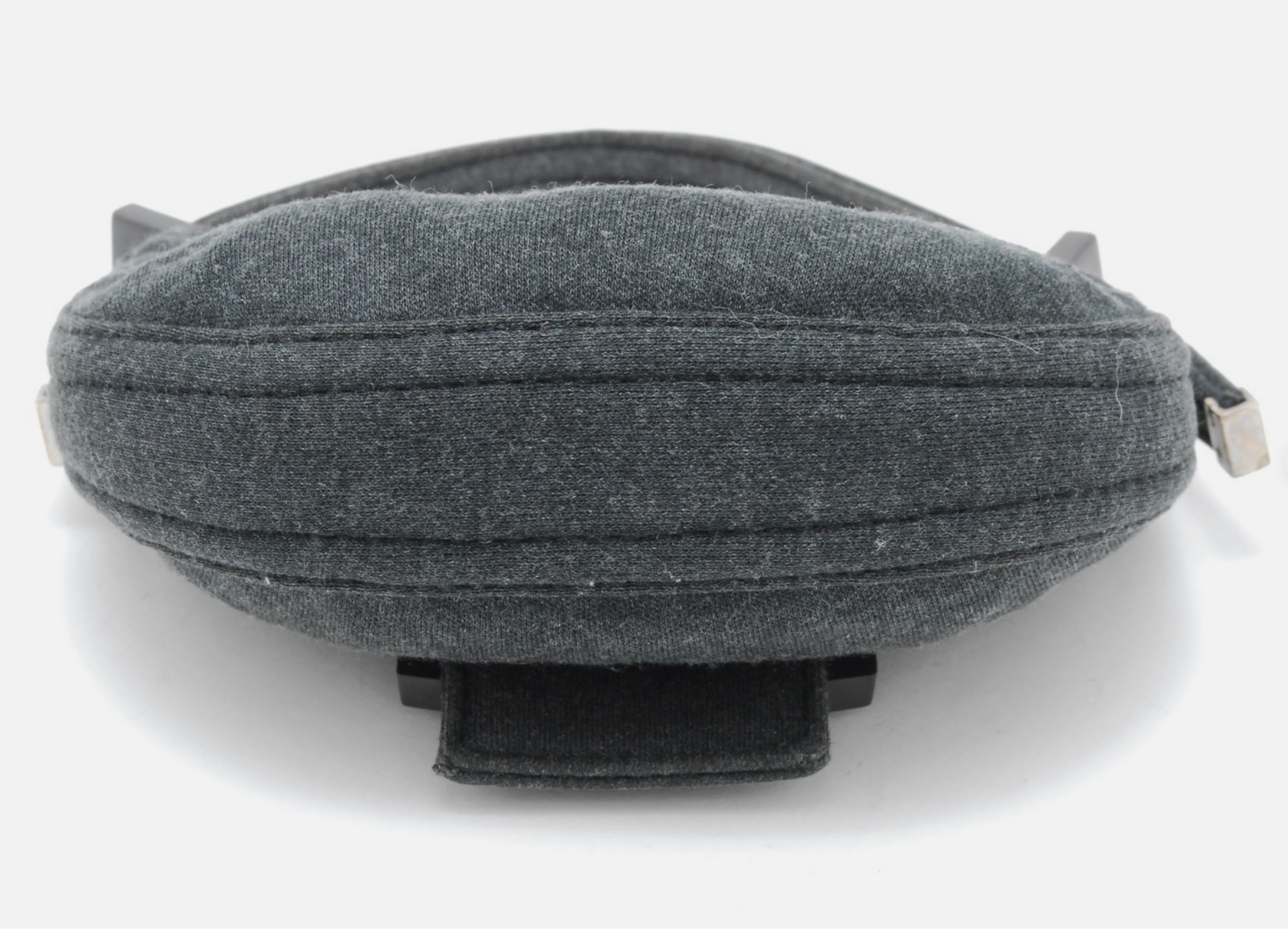 Features: Charcoal gray material with tonal stitching, oversized logo buckle closure. Top handle strap, with a compact croissant silhouette.