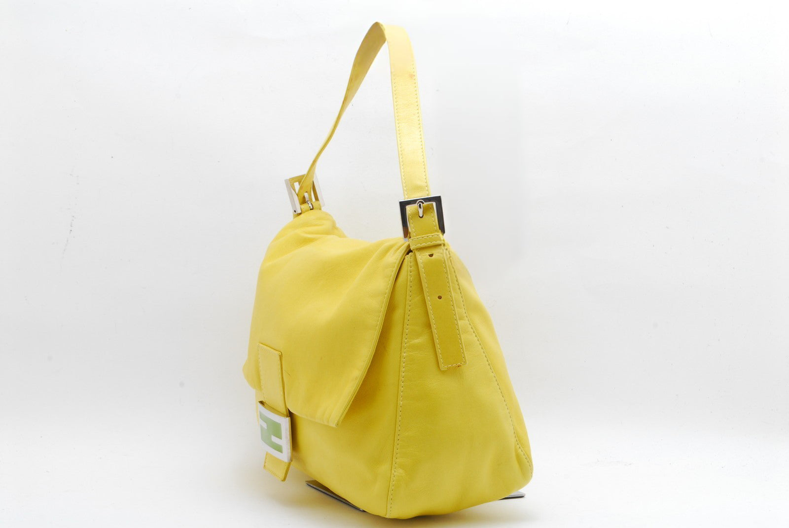 Make a statement with this rare Fendi Mama Bucket Bag in bold yellow leather. Known for its iconic Y2K silhouette, this piece is finished with Fendi’s signature double-F buckle in silver with green enamel detailing. A perfect balance of playful color and timeless luxury. Has an adjustable shoulder strap with silver hardware, flap closure with FF enamel buckle. Spacious, functional interior, and a lightweight/versatile design